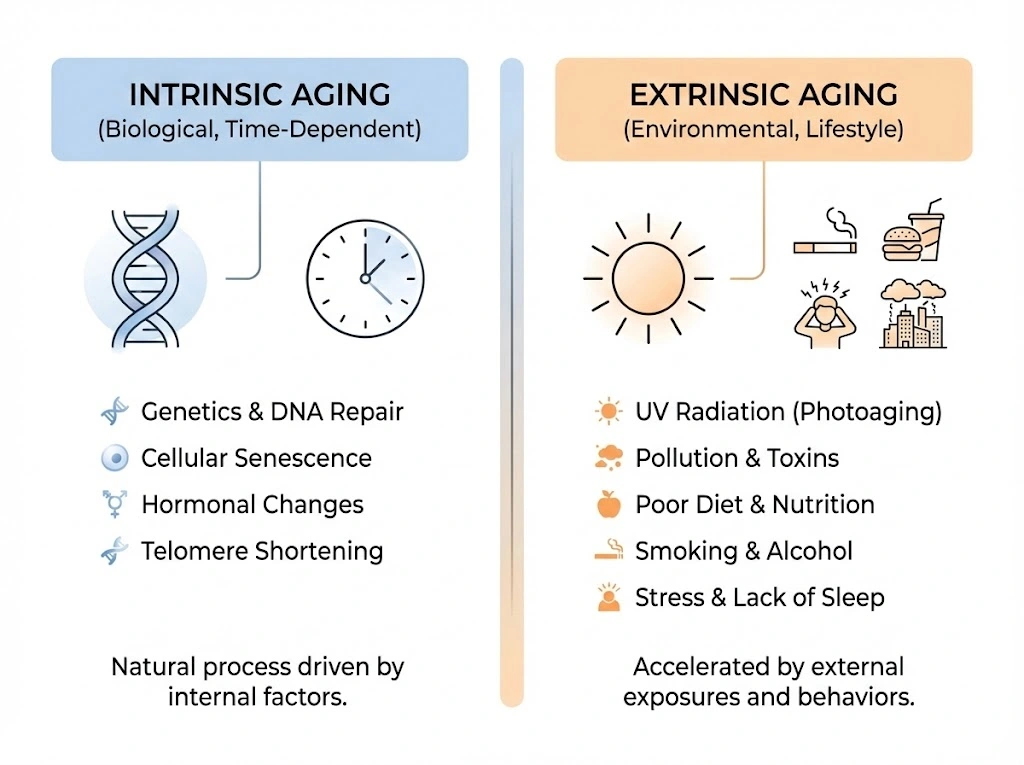 According to dermatology research, extrinsic factors—particularly sun exposure—account for up to 90% of visible skin aging in lighter skin types [2]. This means the way you live has far more impact on how old you look than your genes do.