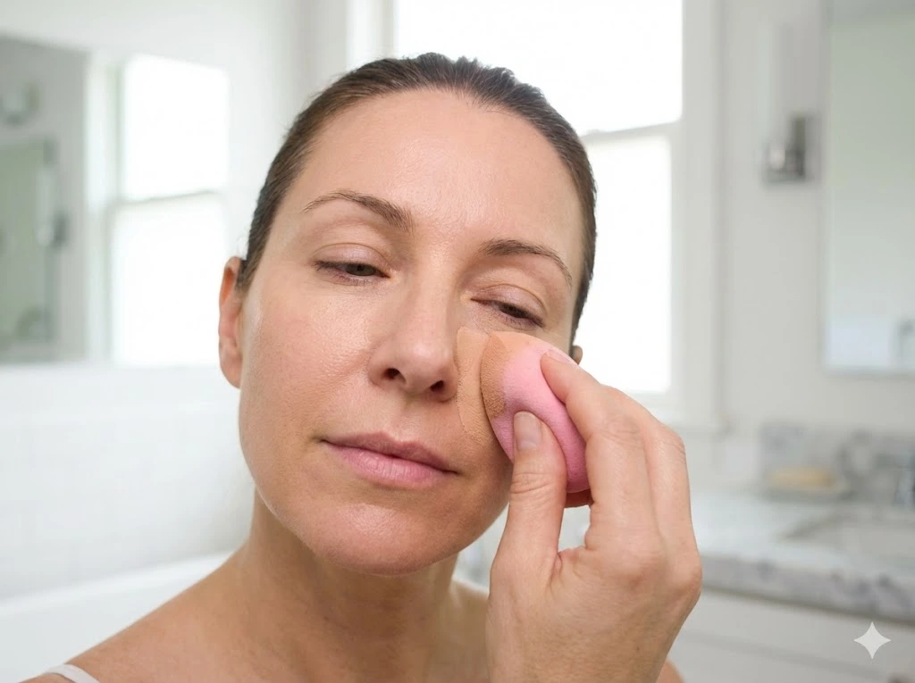 What to do: Use concealer only where you truly need it—typically under the eyes and on specific spots. Choose a shade just one shade lighter than your skin (not two or three shades lighter). Apply in an inverted triangle shape under the eyes, then gently tap to blend. Never rub.