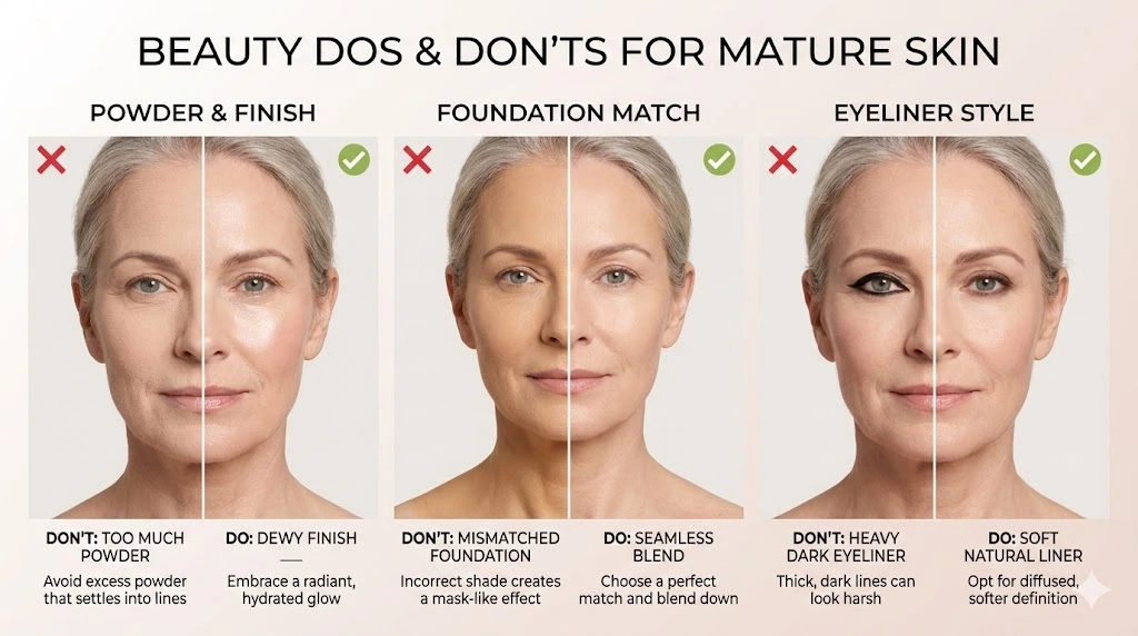 Why it ages: Powder absorbs moisture and settles into every line and pore. On mature skin, this creates a dry, flat appearance that emphasizes texture rather than blurring it.